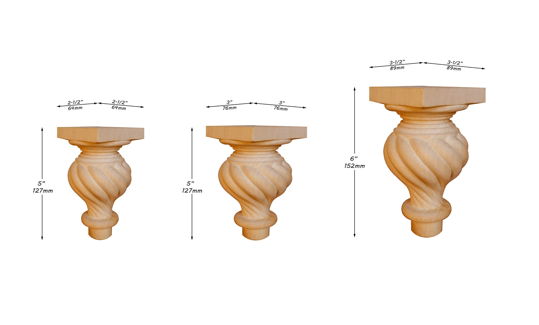 PAIR of Square Top Spiral Rope Carved Furniture Legs, Replacement Bun Feet, Sofa Legs